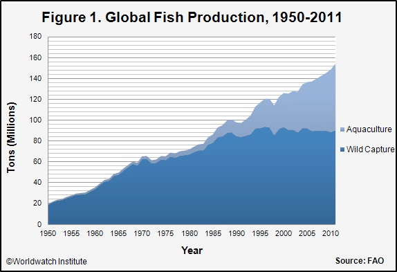Meanwhile, this graph from WorldWatch based on FAO data shows a huge increase in aquaculture during that period: