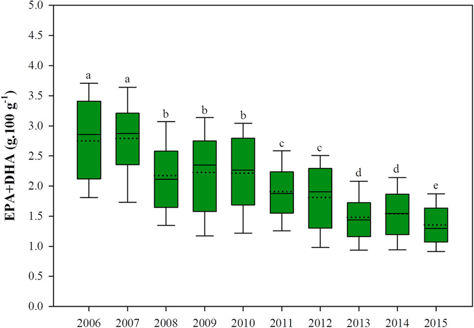This study of farmed Scottish Atlantic salmon already shows a decline in EPA and DHA presumably because of a decrease in fish oil in their feed:
