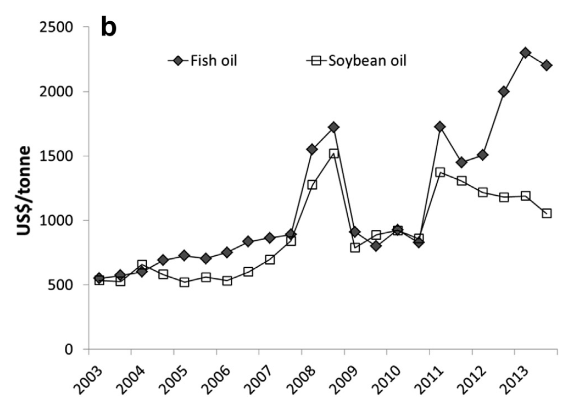 Here’s another graph I found on fish oil prices from 2003 to 2014, showing a substantial price increase after 2011 relative to soybean oil:
