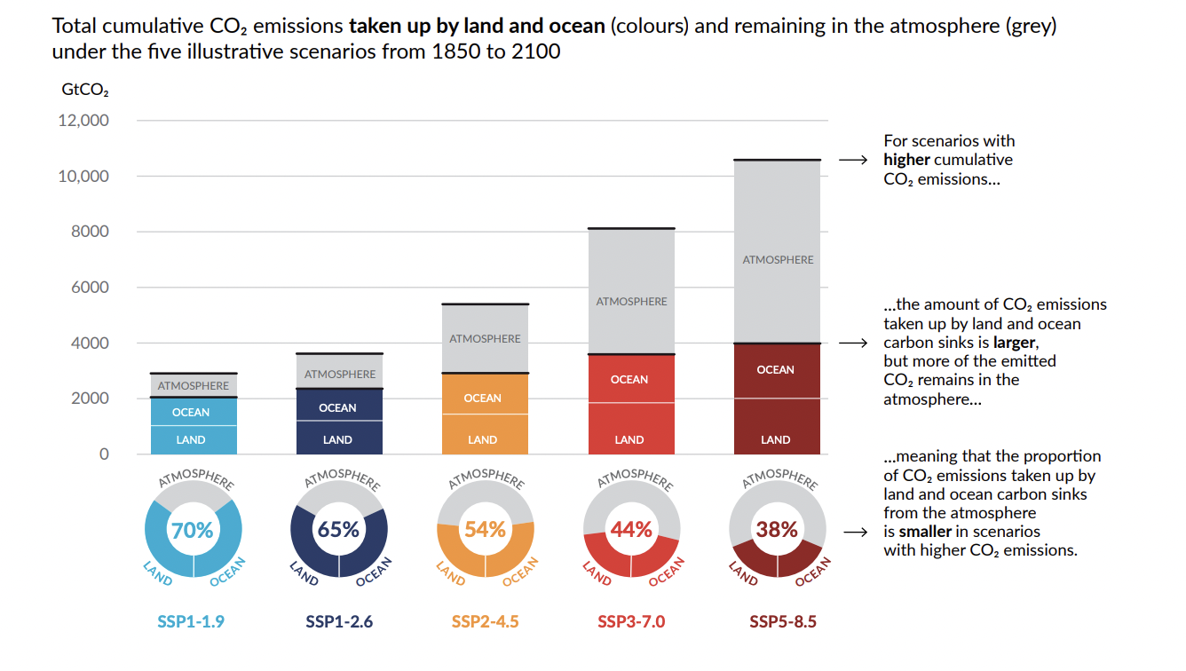 How cumulative emissions translate into CO2 concentrations is model-dependent. 1 ppm of atmospheric CO2 is equivalent to 2.13 gigatonnes of airborne carbon. However, the amount of carbon that we burn that remains in the atmosphere (the airborne fraction) changes with emissions—the airborne fraction increases the more we emit because land and ocean carbon sinks get exhausted, which you can see in the doughnut charts below.
