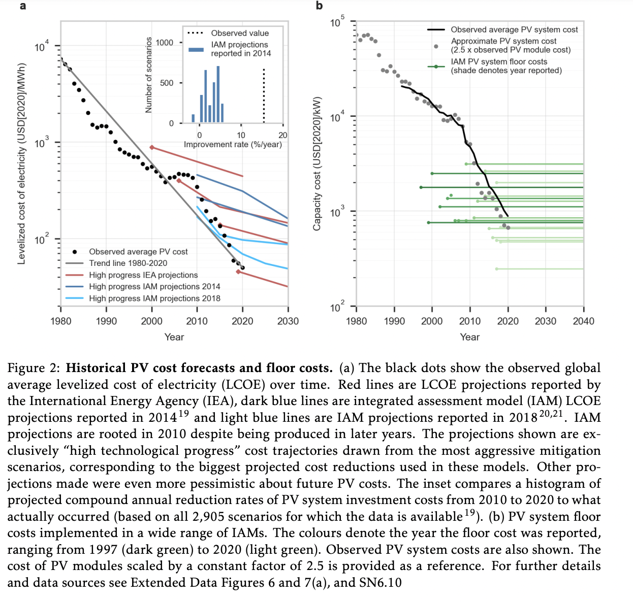 4. “Sound energy investments require reliable forecasts. As illustrated in Figure 2(a), past projections of present renewable energy costs by influential energy-economy models have consistently been much too high. (“Projections” are forecasts conditional on scenarios, so we use the terms interchangeably.) The inset of the figure gives a histogram of 2,905 projections by integrated assessment models, which are perhaps the most widely used type of global energy-economy models19,20,21,22, for the annual rate at which solar PV system investment costs would fall between 2010 and 202019. The mean value of these projected cost reductions was 2.6%, and all were less than 6%. In stark contrast, during this period solar PV costs actually fell by 15% per year. Such models have consistently failed to produce results in line with past trends3,23” Way et al, ‘Empirically grounded technology forecasts and the energy transition’, Oxford Martin School, 2021: p.3.