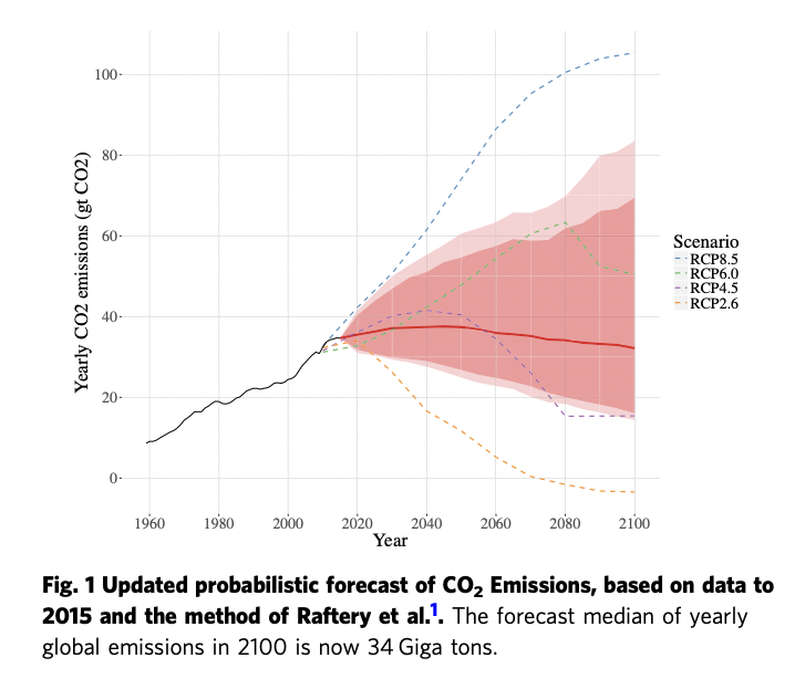 For all these reasons, RCP8.5 now looks much less likely. Even the Integrated Assessment Models that were used to generate different versions of RCP8.5, known as MESSAGE and REMIND, now suggest that a moderate emissions trajectory is the most likely outcome, on current policy.[7] Probabilistic assessments of emissions scenarios are thin on the ground, but recent studies suggest that the chance of RCP8.5 is now well below 5%. See for example, this from Liu and Raftery (2021):