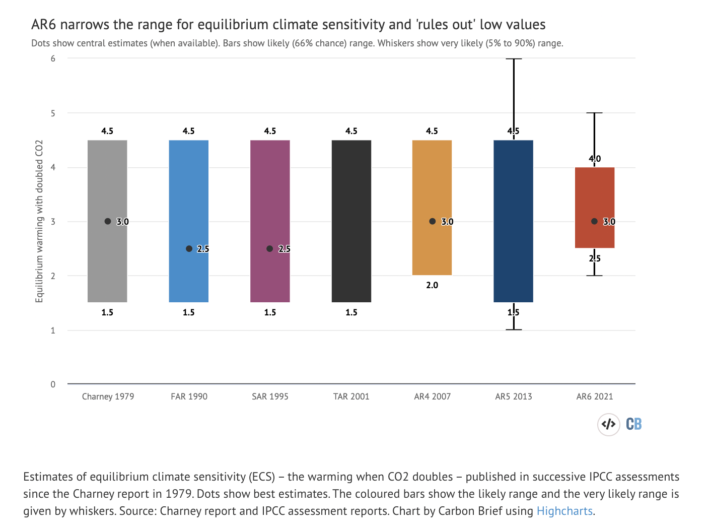The main focus of climate science has been to quantify what is known as equilibrium climate sensitivity, which is the warming we get after a doubling of CO2 concentrations, ignoring the effect that the melting of the ice sheets (which occurs over millennia) might have on temperatures.[9] The new IPCC report finds that the uncertainty around equilibrium climate sensitivity has now narrowed, as shown by this chart from Carbon Brief.