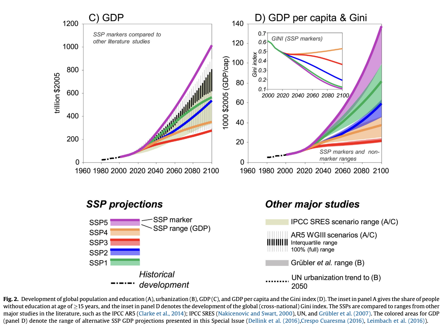 For a long time the climate policy and impacts community was focused on one possible ‘business as usual’ emissions scenario known as Representative Concentration Pathway 8.5 (RCP8.5), a worst case against which climate action would be compared. Each representative concentration pathway can be paired with a socioeconomic story of how the world will develop in key areas such as population, income, inequality and education. These are known as ‘shared socioeconomic pathways’ (SSPs).