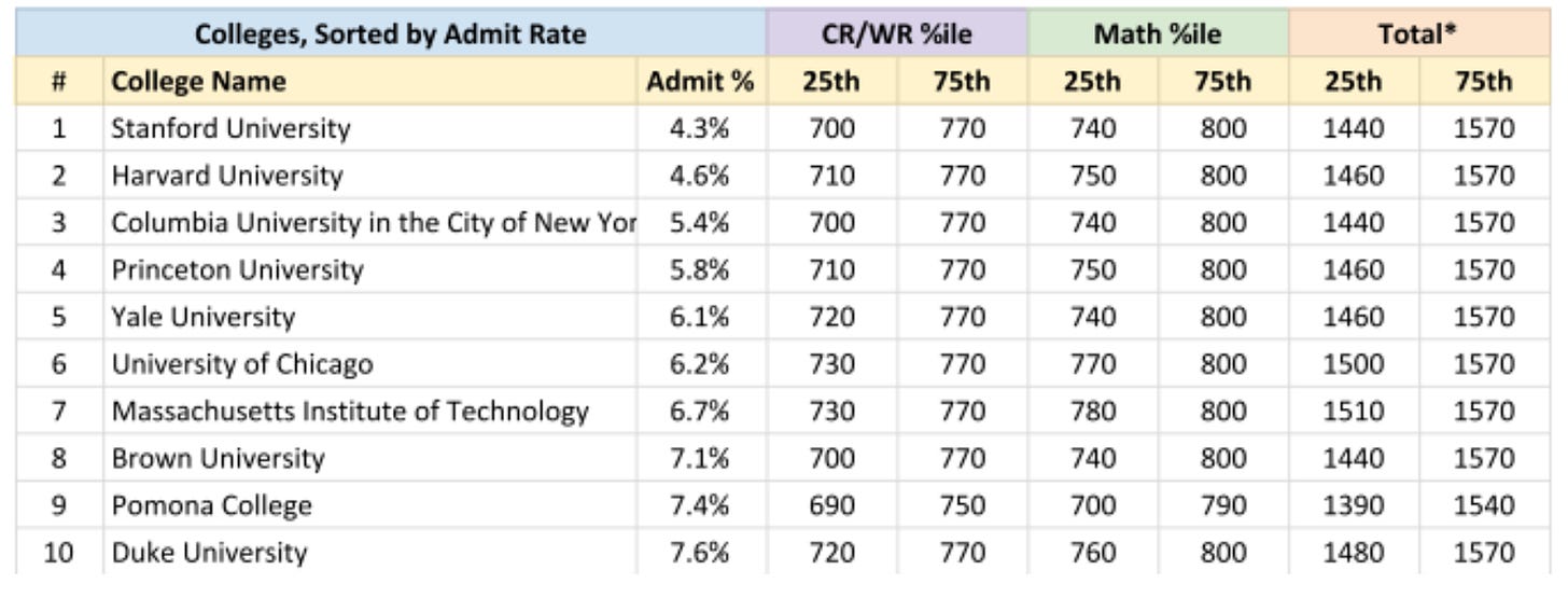 ≥25% of students at ~50 colleges scored at least as well as the median Harvard and Princeton student (1510 SAT). The best students at the top (at least) 50 schools have surprisingly similar academic credentials.