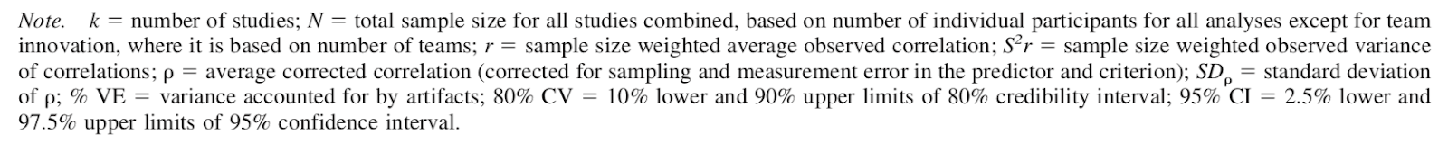 Hülseger, Anderson & Salgado (2009): Team-Level Predictors of Innovation at Work. A Comprehensive Meta-Analysis Spanning Three Decades of Research (“HAS” from now on). They investigated innovation in the workplace at the team level, pre-selecting 15 variables as potential factors. Based on a literature search, they ran a meta-analysis on 104 independent studies over 30 years from before April 2007: N 50,096 (see relevant section for more details).