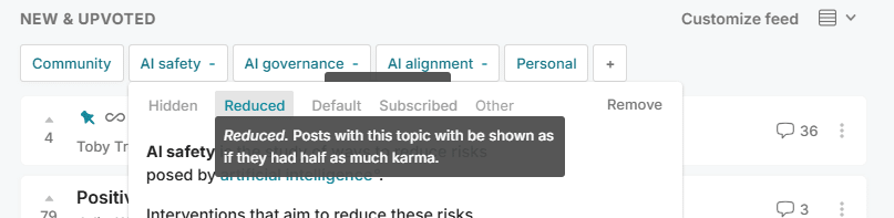 I am keen to try to get a more “cause balanced” view of EA via the excellent EAF. Is my only option to reduce karma by 50% on AI posts? This is how I am currently set up, but it seems a bit of a from-the-hip measure. Maybe there is some way to get a more equal number of posts from each cause area consistently showing in my front page? Would love to hear from people who have successfully “recalibrated” their EAF feed: