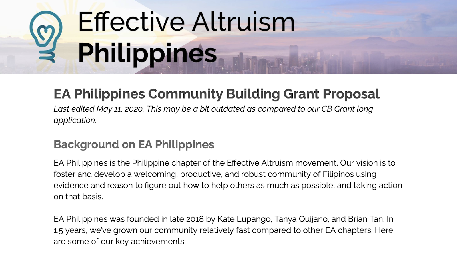 As such, I thought that EA Philippines didn’t fit CEA’s focus, which they talk about in the “Location focus” section in their recently released strategy. After all, no other EA group in Asia was currently on a community building grant.