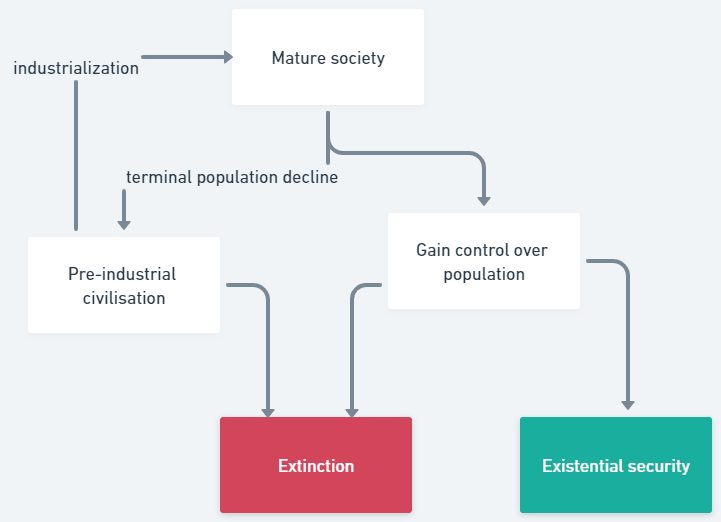 Decline to a pre-industrial state. All known pre-industrial societies have had high fertility, so we should expect this to be the case in a near-empty world that cannot sustain industrialization. It’s possible that this society could “grow back” and one day attain existential security—but there will be plenty of opportunities for things to go wrong.