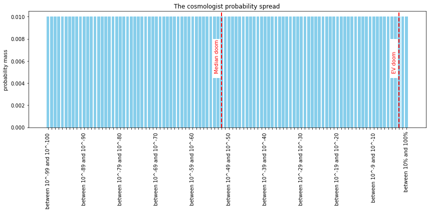 I think the root of the problem in this paradox is that this isn’t a very defensible humble/uniform prior, and if the cosmologist were to think it through more they could come up with one that gives a lower p(doom) (or at least, doesn’t look much like the distribution stated initially).