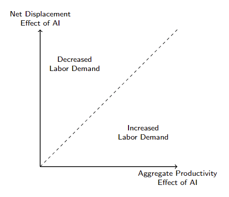 The aggregate productivity effect captures the effect which AI will have on productivity. As AI makes jobs more efficient, production costs and consumer prices will decline. This in turn increases consumers’ purchasing power, stimulating consumer demand across the economy. To serve increased demand, firms in turn raise production, thereby curbing up the demand for labor. Thus, aggregate labor demand increases in the productivity gains AI will bring about.The relationship between these two key factors can be visualized as below, where any scenarios above the dotted line will see reduced labor demand and any scenarios below it will see increased labor demand.