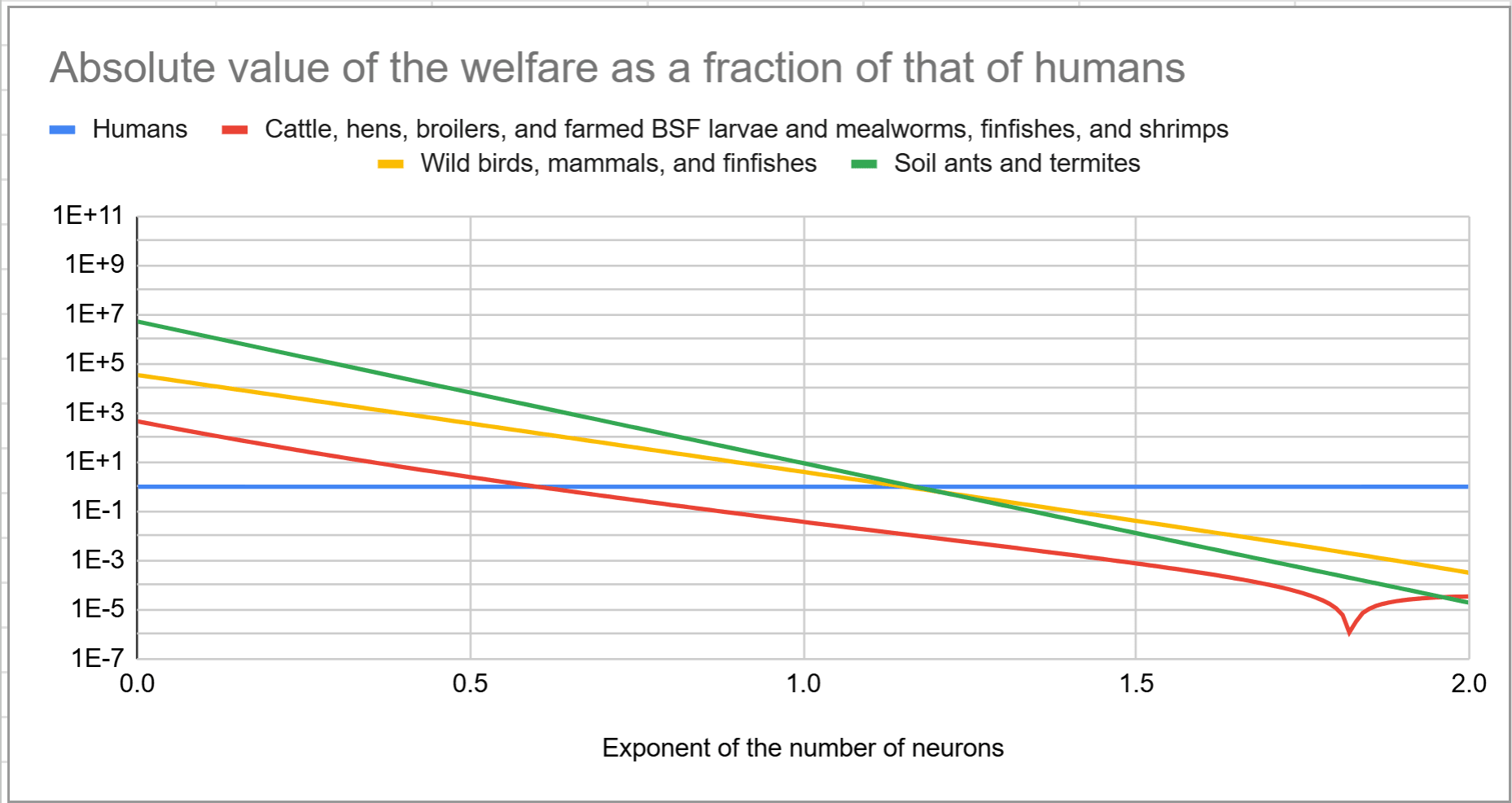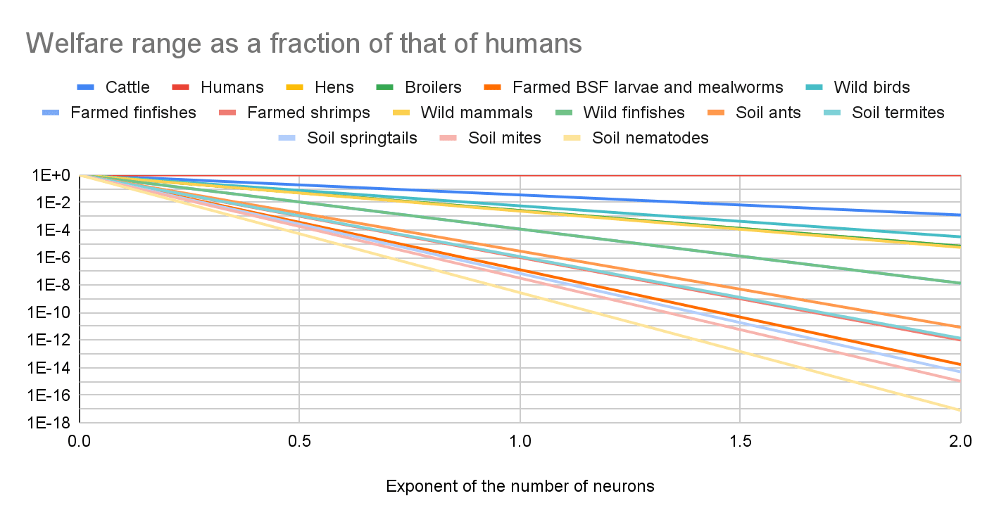 I set the welfare range as a fraction of that of humans to “number of neurons as a fraction of that of humans”^“exponent of the number of neurons”, with the exponent ranging from 0 to 2. For an exponent of the number of neurons of: