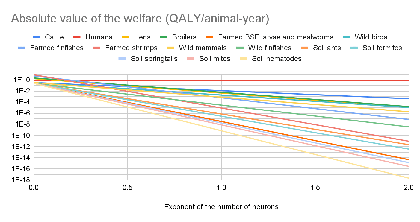 I would not be surprised if the absolute value of the welfare per animal-year decreased much faster than exponentially with the number of neurons for a sufficiently low number of neurons. However, I assume an exponential decrease up to the number of neurons of nematodes given the large uncertainty about whether there is such a transition, and the number of neurons for which it would happen. I believe there should be some models according to which the welfare per animal-year does not abruptly go to 0, and the expected welfare per animal-year will be determine by such models.