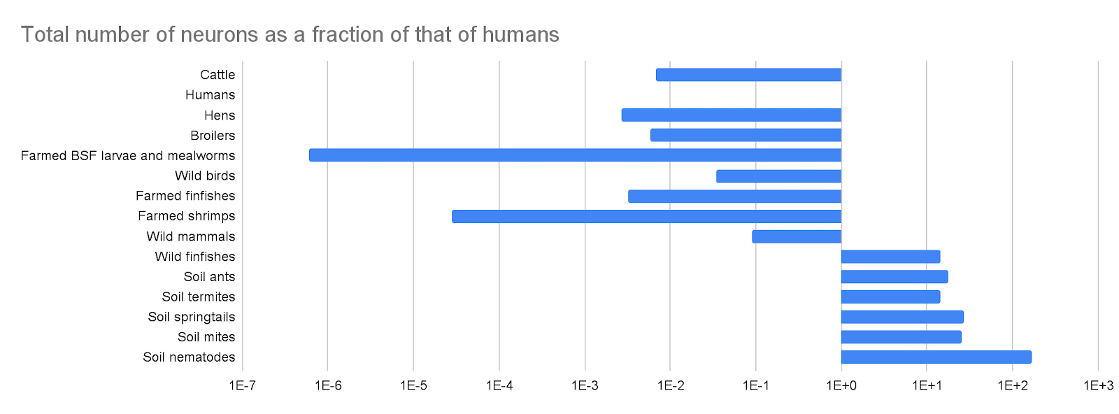 Cattle, hens, broilers, and farmed BSF larvae and mealworms, finfishes, and shrimps have 1.87 times as many neurons as humans, and −52 and −2.48 times as much welfare for exponents of the number of neurons of 0.19 and 0.5.