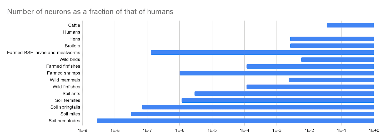 | Animals | Population | Population as a fraction of that of humans | Number of neurons | Number of neurons as a fraction of that of humans | Total number of neurons | Total number of neurons as a fraction of that of humans | Welfare per animal-year as a fraction of the welfare per fully-happy-animal-year |