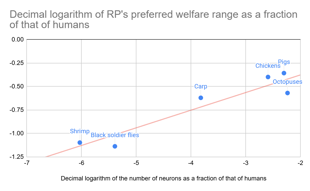 RP’s moral weight project included a report by Adam Shriver concluding “there is no straightforward empirical evidence or compelling conceptual arguments indicating that relative differences in neuron counts within or between species reliably predicts welfare relevant functional capacities”. I guess there are other factors besides the number of neurons that influence the welfare range. However, an exponent of 0.188 explains 78.6 % of the variance of the estimates in Bob’s book. I get this exponent from the slope of the below linear regression with null intercept of the logarithm of RP’s preferred welfare range as a fraction of that of humans on the logarithm of the number of neurons as a fraction of that of humans. I rely on a simple formula for the welfare range to decrease noise, and easily obtain estimates for animals not covered in the book to explore implications for cause prioritisation.