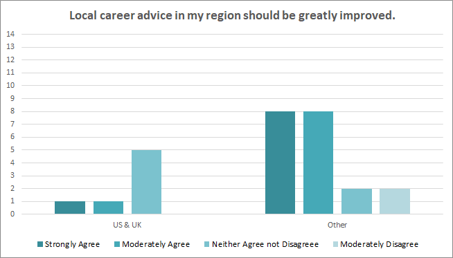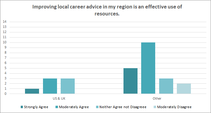 70% of respondents agree that local career advice in their region should be greatly improved, and 67% agree that itâs an effective use of resources. There are clear differences by geography where 80% of other groups agree that local career advice in their region should be greatly improved compared to only 28% of US & UK groups. Although 71% of US & UK respondents were not sure whether local career advice should be greatly improved, 57% still thought that improving it was an effective use of resources. These questions were poorly phrasedâfor example, respondents may believe that there are moderate improvements to be made to local career advice, and that these improvements are an effective use of resources.