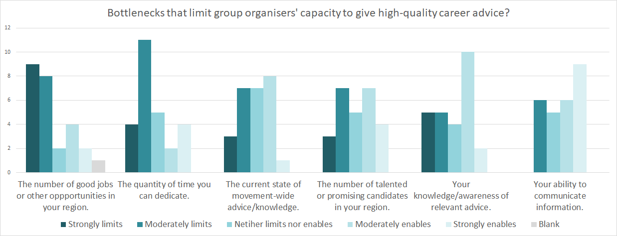 | How much they prioritised career advice | Respondents who prioritised career advice would likely have more accurate or extensive knowledge on challenges their members faced, and we should give more weight to their answers. We didnât end up doing this, because organisers who prioritised career advice less made fewer points about their membersâ bottlenecks (which we cover in the second post). |