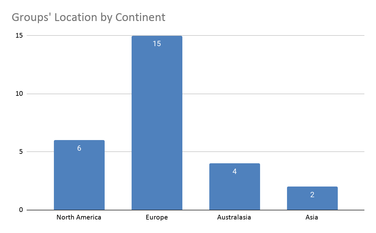 Rethink Charity does an annual group organiser survey, and we will contrast our respondentsâ demographics to their 2019 Survey (henceforth the 2019 Survey). The relative proportions of respondents are similar to the 2019 Survey (see Table 1 below) with the exception of the US, which is underrepresented and the Australasia region and Canada, which are overrepresented. The top 5 countries with the highest responses for our survey were the UK (4 responses), Canada (3), Australia (3), Germany (3) and the US (3).
