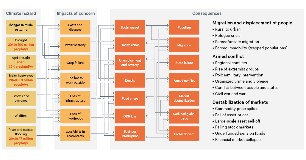 An expert elicitation exercise conducted by 70 diverse experts identified major dynamics and impacts from climate change, such as increases in migration, armed conflict and destabilization of markets. The figure below shows a summary diagram of the major systemic risk dynamics identified. (For a higher resolution picture, click here.)