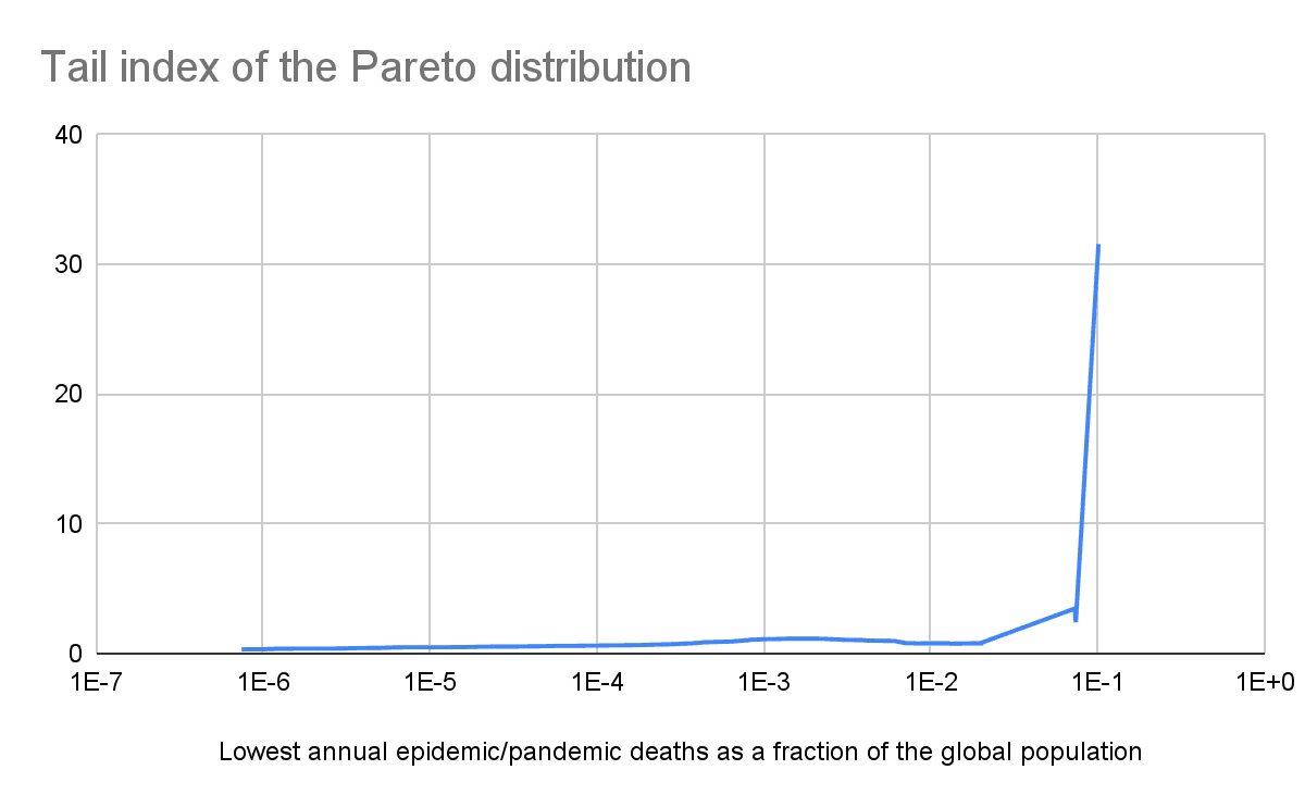 The tail distribution decays faster for higher tail indices. A tail index of 1 (10) means annual epidemic/pandemic deaths as a fraction of the global population are 10 % (10^-10) likely to become 10 times as large.
