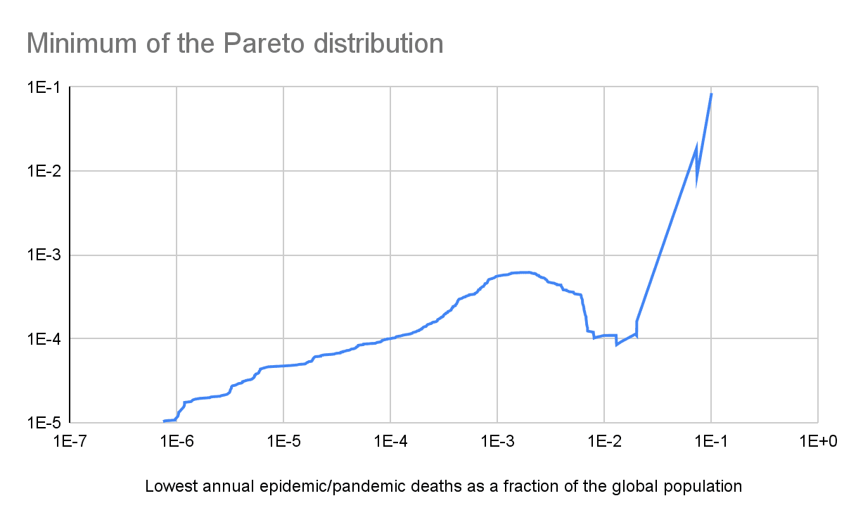 Then increases to 0.00107 % for 7.39 % lowest annual epidemic/pandemic deaths as a fraction of the global population.