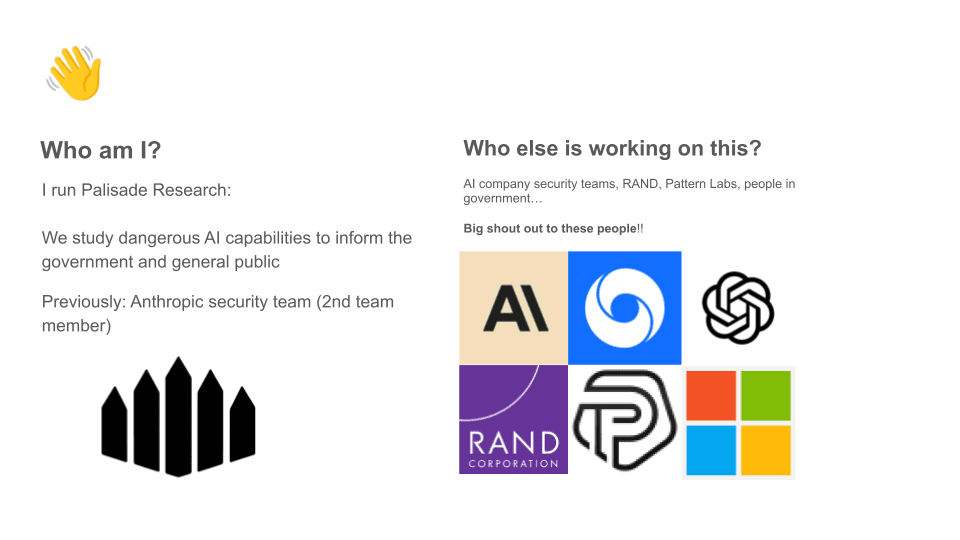 I was already introduced, so I don’t need to say much about that. I was previously at Anthropic working on the security team. I have some experience working to defend AI companies, although much less than some people in this room. And while I’m going to talk about how I think we’re not yet there, I want to be super appreciative of all the great people working really hard on this problem already — people at various companies such as RAND and Pattern Labs. I want to give a huge shout out to all of them.