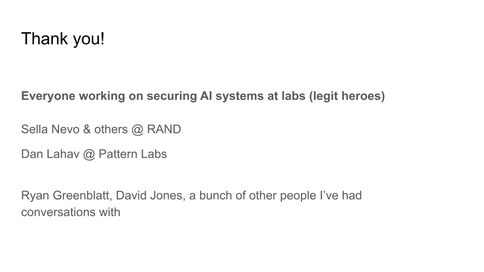 Okay, so I want to really thank all of the people who are currently working on this problem. I especially want to thank people who are working at labs in the trenches, trying to secure these systems right now. I also want to thank the people at RAND who are working on the RAND report. They’ve interviewed a lot of top people in the government and at companies. And they’ve really just done a great job documenting all of the controls we need to achieve these different levels of security. Without that roadmap, it would be very hard to know what to do. And now that we have it, it becomes a lot more clear that these are achievable. They would take a lot of work, but we can actually start to orient around what they are. So I’m super grateful for that work. And Dan Lahav at Pattern Labs, as well as Ryan and David, and many other people I’ve had conversations with. I super appreciate them.