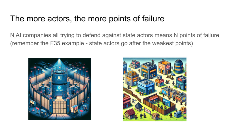 First, there’s the “tragedy of the commons” problem. I don’t think that companies have sufficient incentive to invest in the necessary resources. Doing so would be a huge burden. This isn’t on the slide, but I was just thinking about how there’s a cultural element to this as well: Companies aren’t set up like the Manhattan Project was to ensure that your things don’t get stolen by state actors.