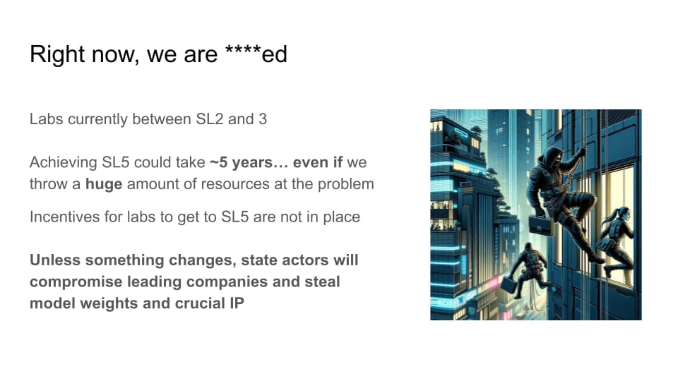 So, where are we right now? My informed guess is that most labs are somewhere between Security Level 2 and Security Level 3. That means that we are fairly secured against most opportunistic attackers. We are not fully secured against well-resourced, non-state actors, though I think this might vary by company quite a bit. We are not secured against moderately resourced attacks from state actors. And we are definitely not secured against high-priority, high-investment attacks from top state actors. I think that’s roughly the state of things.