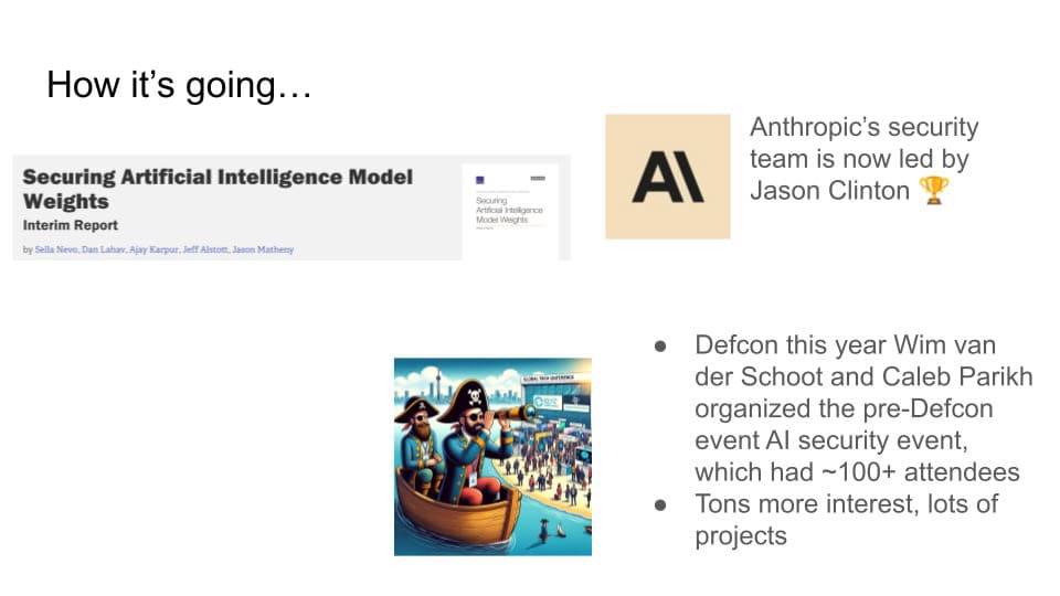 Here’s how it’s going now. RAND is now doing a lot of work to try to map out what is really required in this space. The security team at Anthropic is now a few dozen people, with Jason Clinton leading the team. He has a whole lot of experience at Google. So, we’ve gone from two part-time people to a few dozen people — and that number is scheduled to double soon. We’ve already made a tremendous amount of progress on this problem. Also, there’s a huge number of events happening. At DEF CON, we had about 100 people and Jason ran a great reading group to train security engineers. In general, there have been a lot more people coming to me and coming to 80,000 Hours really interested in this problem. So, in two years’ time, we’ve made a huge amount of progress, and I have a little bit of optimism.