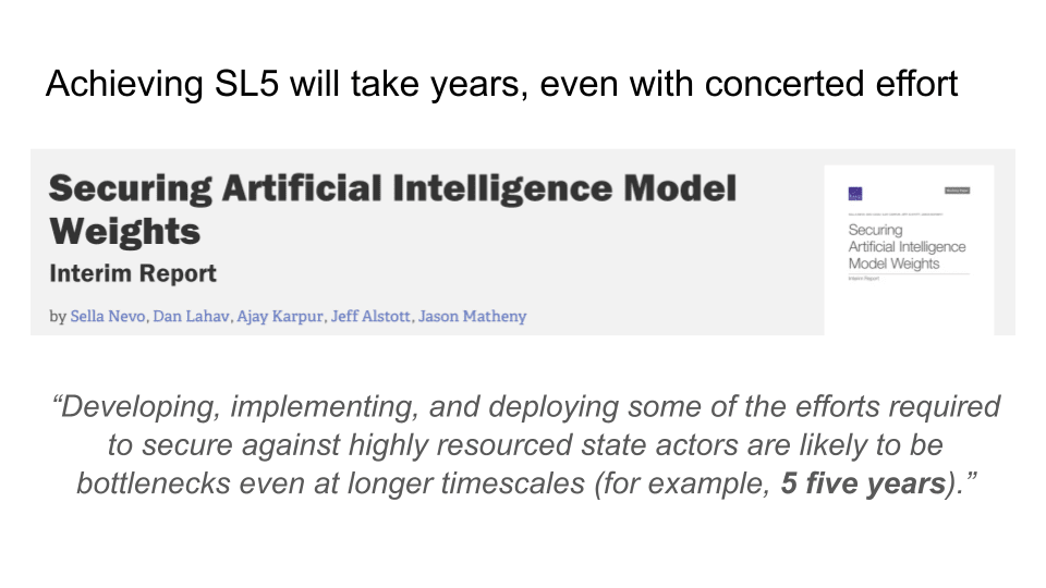 This might be one of the most important points. First of all, companies do have incentives to secure model weights. It’s extremely valuable IP. And most people and companies don’t want bad things to happen in the world. I’m not arguing that there are no incentives, I’m just arguing that the incentives aren’t sufficient to get to Security Level 5. They might be sufficient to get to Security Level 3, and maybe even Security Level 4 for some companies. But I think getting all the way to where we need to go is very unlikely to happen given the current incentives.