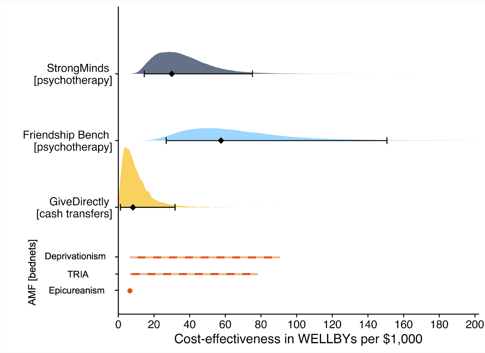 Note. The diamonds represent the central estimate of cost-effectiveness (i.e., the point estimates). The shaded areas are probability density distribution and the solid whiskers represent the 95% confidence intervals for StrongMinds, Friendship Bench, and GiveDirectly. The lines for AMF (the Against Malaria Foundation) are different from the others[5]. Deworming charities are not shown, because we are very uncertain of their cost-effectiveness.