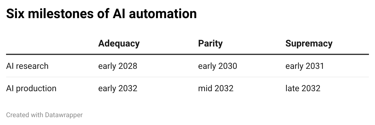 In theory, we can talk separately about the entire spectrum from adequacy through parity to supremacy for any sector, from agriculture to pharmaceuticals to finance. But two domains are likely to set the pace for all the rest: AI research and AI production (that is, the entire stack of chips, fabs, fab equipment manufacturers, power plants, and everything else that goes into producing and running AI systems). If we cross the three automation thresholds with these two domains, we get six milestones. Here are my current best guesses for when we cross these milestones: