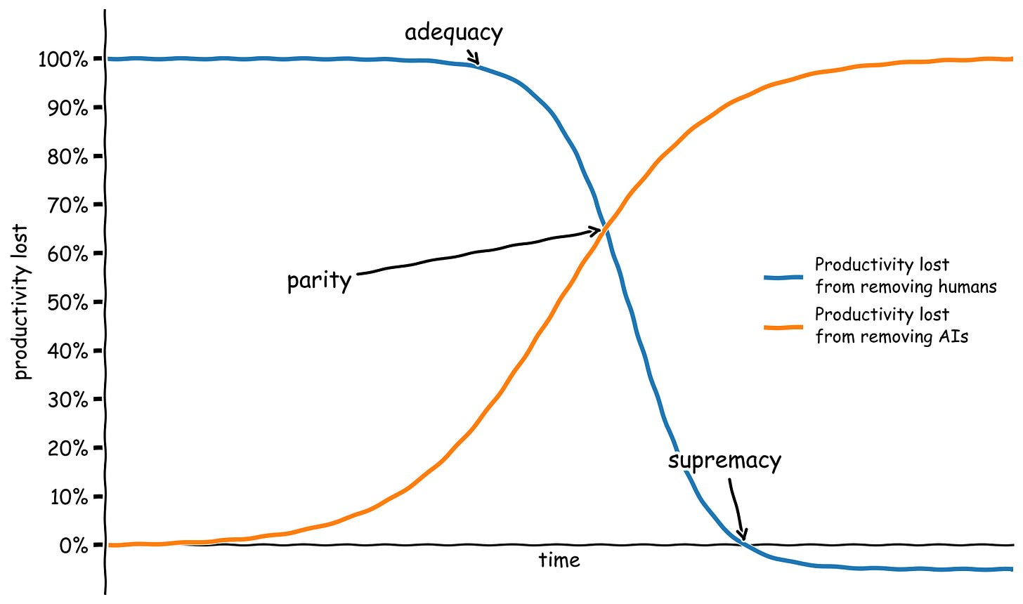 Beyond parity, we can talk about supremacy — the first point when productivity in a given sector would actually increase from removing humans. In other words, a major sector of the economy would become like chess. If for some reason you wanted to win as many chess games as possible per dollar, unaided computers would crush human-computer teams right now. A human-AI team can technically draw against an AI opponent, if the human defers to their AI teammate about every move. But the human is pure deadweight here. Supremacy is the point where it’s no longer worth the overhead to deal with humans or the cost of the food they need to stay alive.