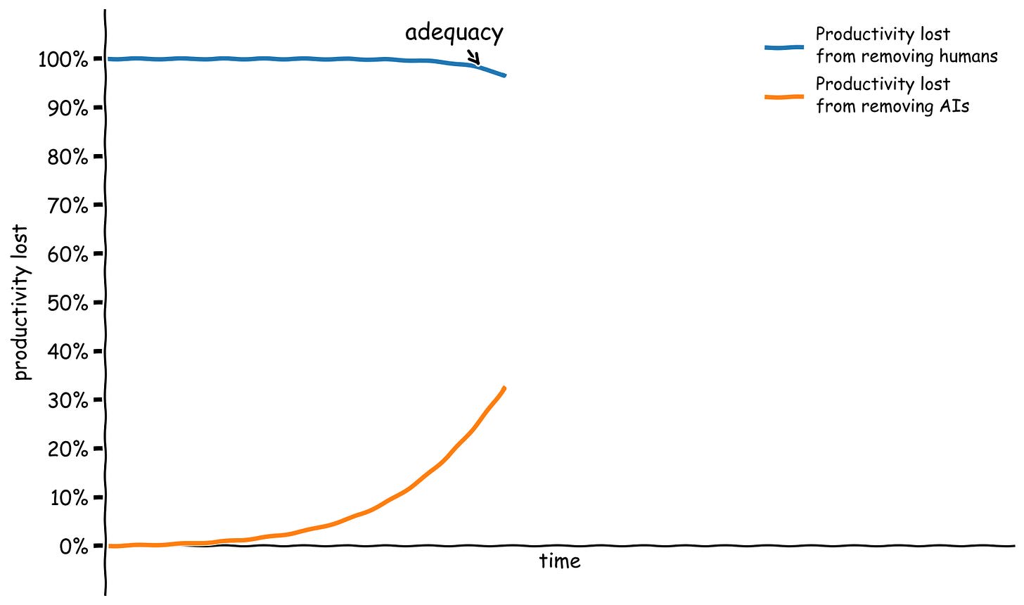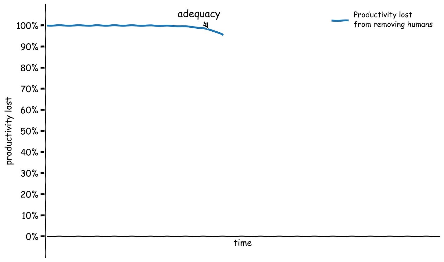 One salient milestone is the very first time the hit from removing humans is smaller than 100% in a given sector — the first time that machines can just barely produce output in that sector, painstakingly limping along by themselves without any humans to operate them. Let’s call this milestone adequacy. At this point, removing humans would still result in a catastrophic hit to output, but it’s still an unprecedented leap that unaided machines can make forward progress at some non-zero pace.