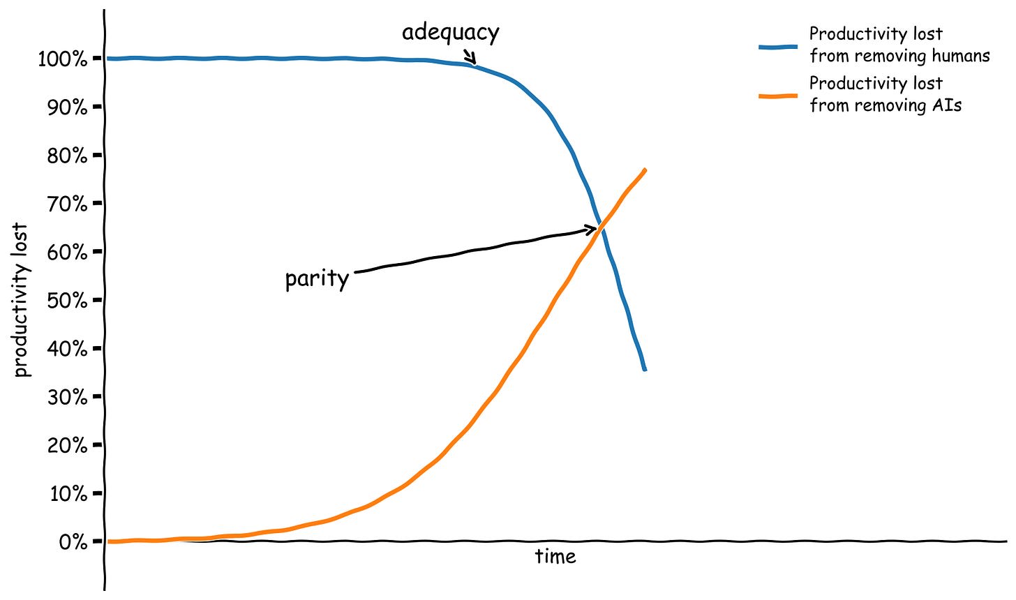 Once AIs reach adequacy in a certain sector, they will keep improving. The next interesting milestone is parity — the first point when getting rid of the AIs slows down progress in the sector more than getting rid of all the humans. The first time parity is reached, it’s likely that humans will still be better than AIs at many important subtasks, so getting rid of them and forcing the AIs to do those tasks instead would result in a substantial hit to productivity. It’s just that human labor as a whole is less important for productivity than AI labor.