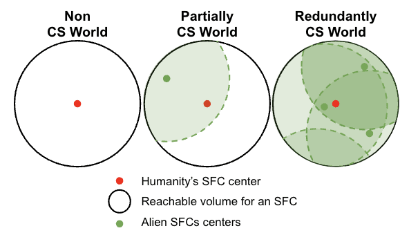 We care about Humanity making a decision, which relies on MCSh instead of MCSw. The Civ-Saturation Hypothesis[1] is ultimately about whether Humanity should focus on “Extinction Risks” or “Alignment Risks/Future Value”. An formal framing is that this hypothesis is about whether we should focus on increasing P(alignment AND Humanity creates an SFC)[4] or P(alignment | Humanity creates an SFC). Moreover when making a decision, we need to take into account all information available to us, such as Humanity’s SFC appearance time. Because of this, it is possible that we live in an almost fully Civ-Saturated world while the optimal choice for Humanity is still to optimize P(alignment AND Humanity creates an SFC)[5]. An simple example is if we knew Humanity would be one of the last and very late potential SFCs to appear inside an almost fully Civ-Saturated world. In that case, most the resource we would grab first would be lost if we don’t exist, because we would only grabbed resources not reachable by other SFCs. Then the optimal choice would be to focus on increasing P(alignment AND Humanity creates an SFC) and not P(alignment | Humanity creates an SFC), and thus to partially focus on creating an SFC. Overall, when making a decision from within Humanity, we will need to look at the Marginal Civ-Saturation within Humanity’s SFC future grabbed space. Another way to understand it is that the space that Humanity’s SFC will impact is special. It is NOT a random part of the world. It is a part of the world in which we were able to appear.