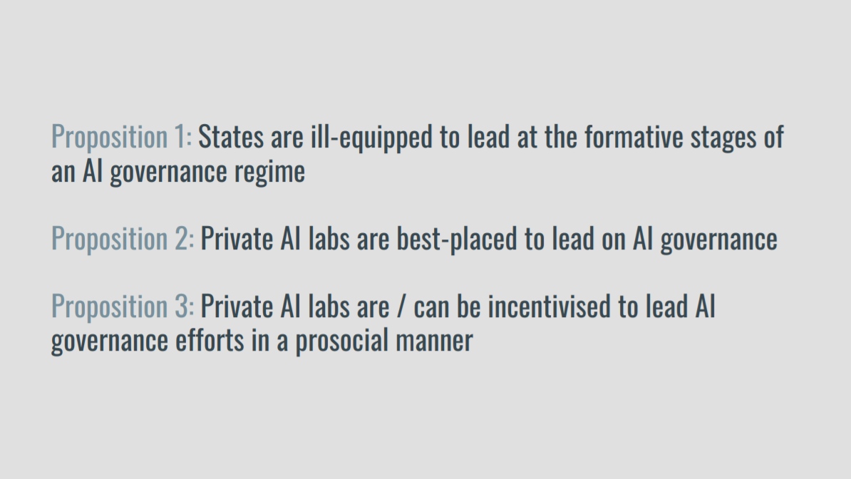 I think the AI policy / governance field is mature enough at this point that it’s not that helpful to think of an AI governance regime as one unitary thing. I much prefer thinking about specific areas of AI governance. Depending on the area, I’d likely have different views on 1-3. For example, it seems likely that companies are best placed to help develop standards that may be used to inform legislation further down the line. I wouldn’t expect companies to be best placed to figure out what the US should do wrt updates to antitrust regulation.