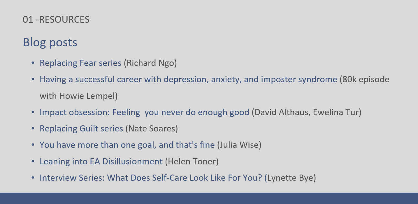First, I will discuss some common mental health challenges. Then, given that this is a workshop, I will invite you to try out a few exercises that might be helpful for getting a better grasp of your mental health struggles, as well as how to address them. Most of all, I hope that we can begin a discussion about mental health in the global catastrophic risk community. I’m keen to hear if you have any ideas about what type of psychological support or mental health resources you or others in the community might find helpful, and I will share a short list of resources at the end of the workshop as well.