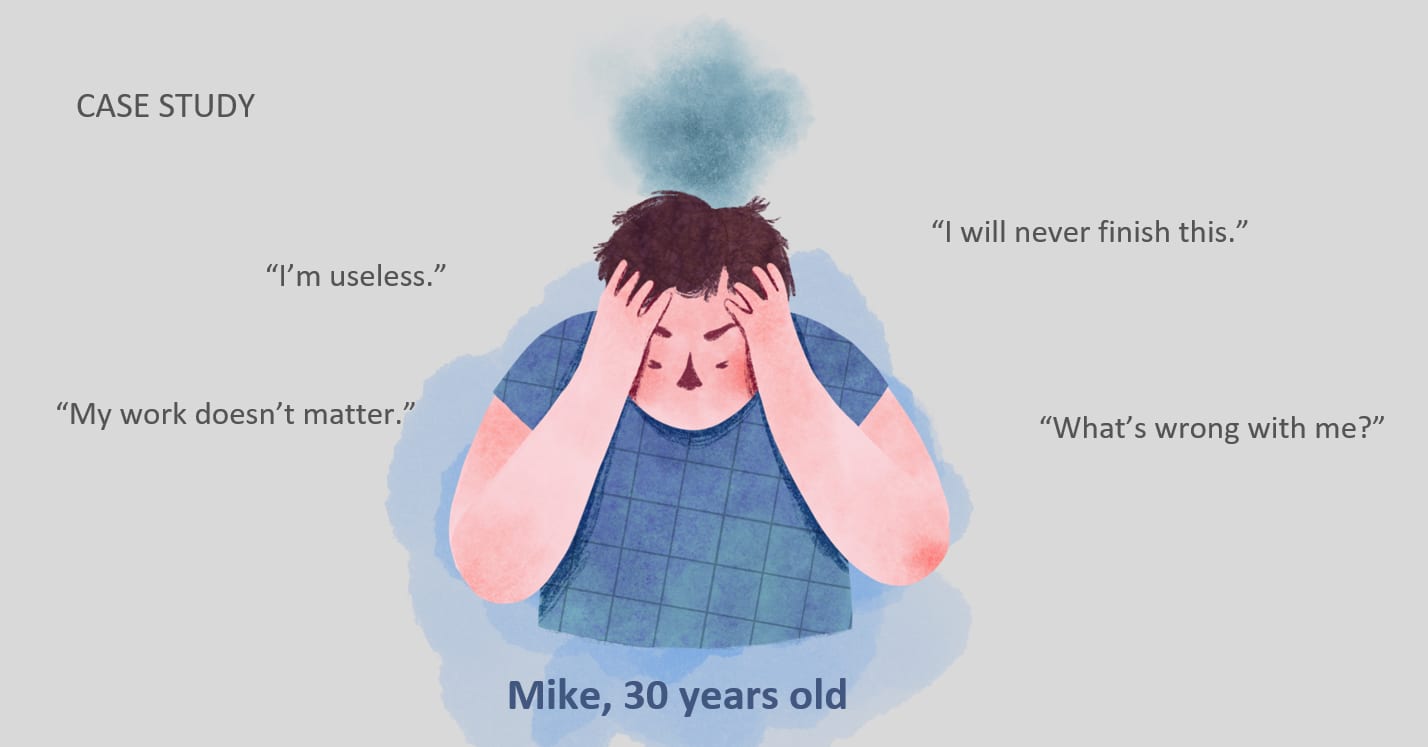 In this part of the workshop, I introduced a case study of Mike, a hypothetical x-risk researcher struggling with low mood, poor sleep, and overwhelming feelings at work. Audience members explored how Mike’s self-comparison, negative self-talk, and unhelpful work habits contributed to his challenges. They then shared their own relevant experiences.