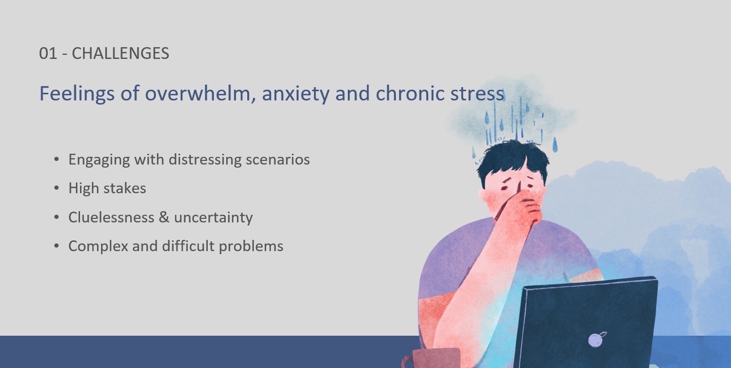 So that being said, I want to now focus on the more tricky aspects of working on x-risks. The first category of mental health challenges I often come across relates to chronic stress, anxiety, and frequent feelings of being overwhelmed, as many roles in the space involve thinking about pretty grim scenarios that involve death, immense suffering, and all sorts of potentially catastrophic outcomes. That, of course, can be psychologically distressing in and of itself, especially because many people who end up working in this space are not motivated by simply wanting to satisfy their intellectual curiosity, but are sincerely motivated to reduce suffering and improve the world.