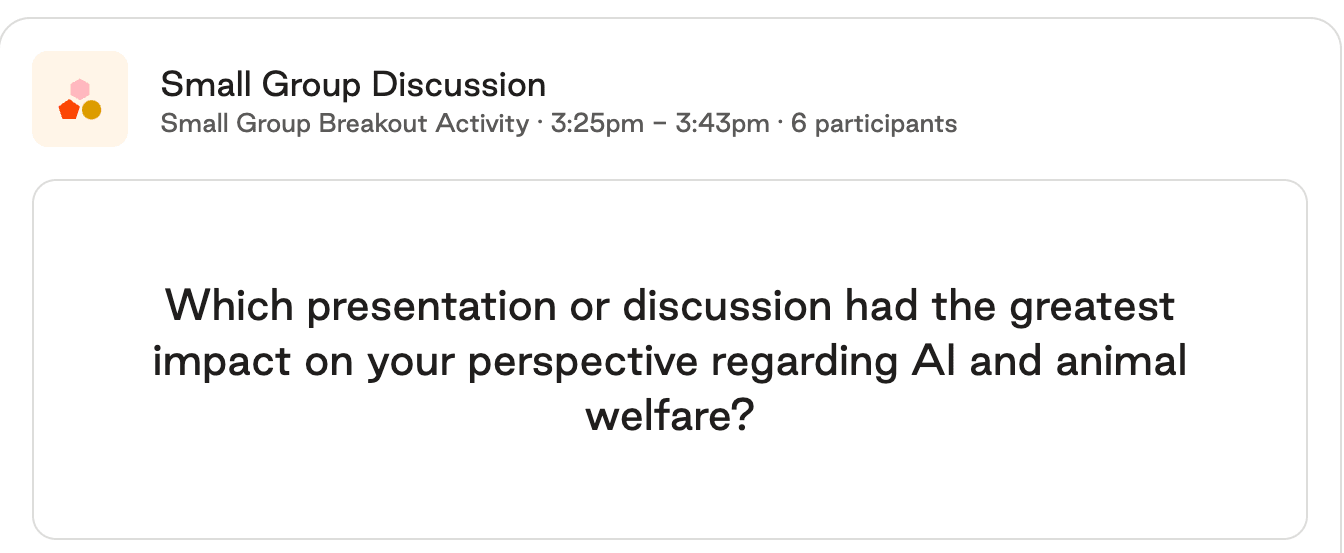 Many people said they updated their thinking in response to talks or discussions from the event. This was especially true for Bob Fischer’s talk Animal-friendly AI = Misaligned AI and conversations during the retreat with James Faville where he talked about backfire risks of certain interventions and s-risks with digital minds.