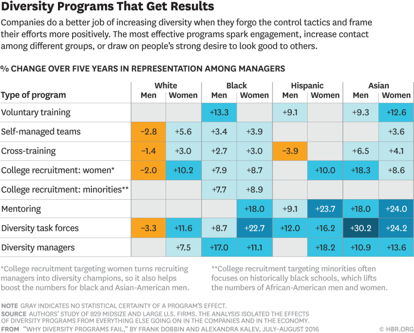 • Diversity trainings generally have no effect on diversity, seem to have a negative effect at least as often as they have a positive one[15] and have no lasting effect on outcomes various researchers have used as proxies for inclusiveness. What specific features and conditions might make a training effective, ineffective, or counterproductive are understudied, but one meta-analysis (which found generally positive effects of trainings and was smaller in scope than the meta-analysis above that found no effect), suggests that they are more effective when they are used in combination with other initiatives, when they target both awareness and skill development, and when they are conducted over a significant period of time.