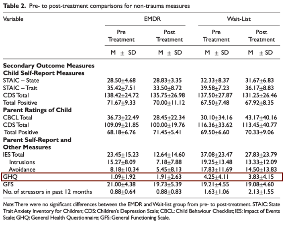 “Despite random allocation to group, wait-list parents reported higher self-reported health problems on the GHQ – 12” Kemp et al. (2009)