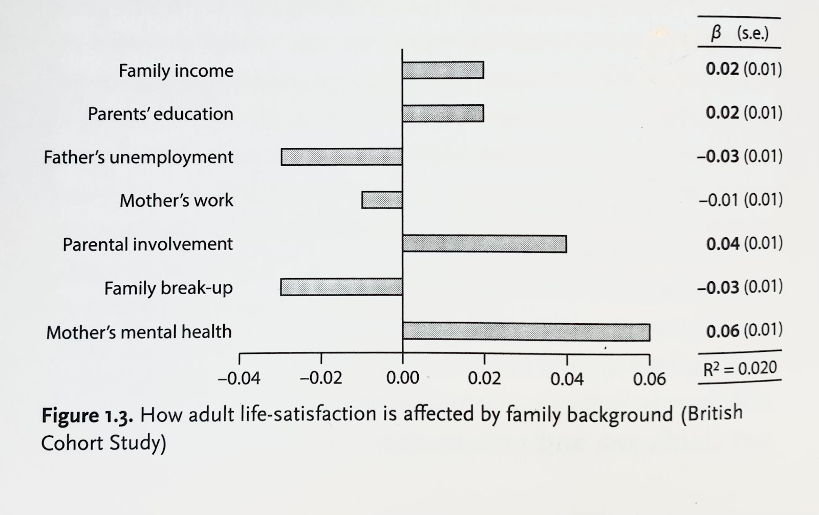 Powdthavee & Vignoles (2008), which found the effect of mother distress in the previous period on children is 14% of the effect that the child’s own wellbeing in the previous period had on their present wellbeing. But it also seems to give weirdly small coefficients (and non-significant) for the effect of log-income on life satisfaction (0.054 for fathers, negative −0.132 for mothers).