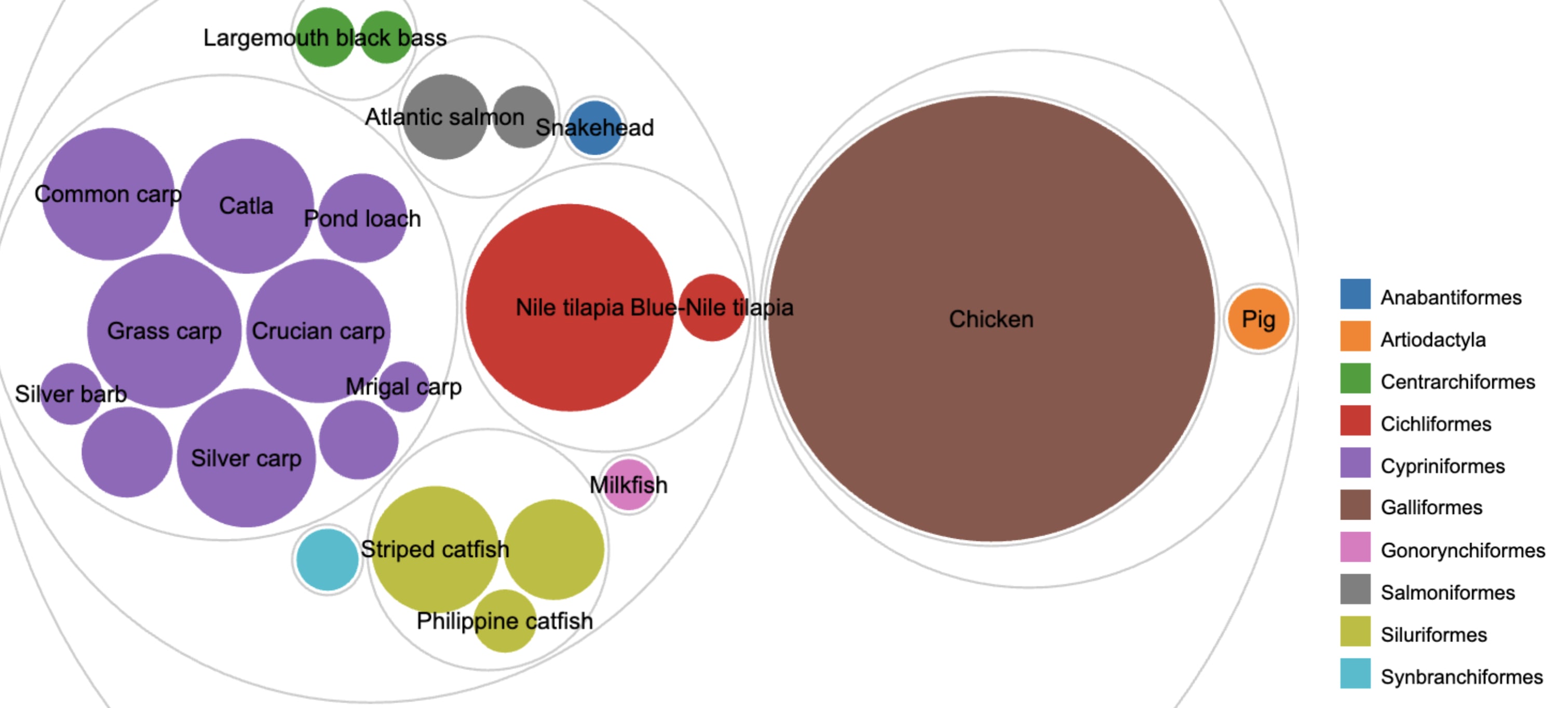 Figure 1. The 22 species comprising 85% of global farmed aquatic vertebrates (2023), compared to terrestrial production at scale. Bubble size is proportional to number of individuals. Colors indicate taxonomic order-- 8 orders are present within the 85%. The remaining 15% spans 259 additional species not shown.