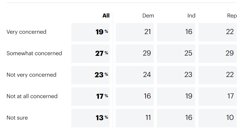 46% say that they are “very concerned” or “somewhat concerned” about the possibility that AI will cause the end of the human race on Earth (with 23% “not very concerned, 17% not concerned at all, and 13% not sure).