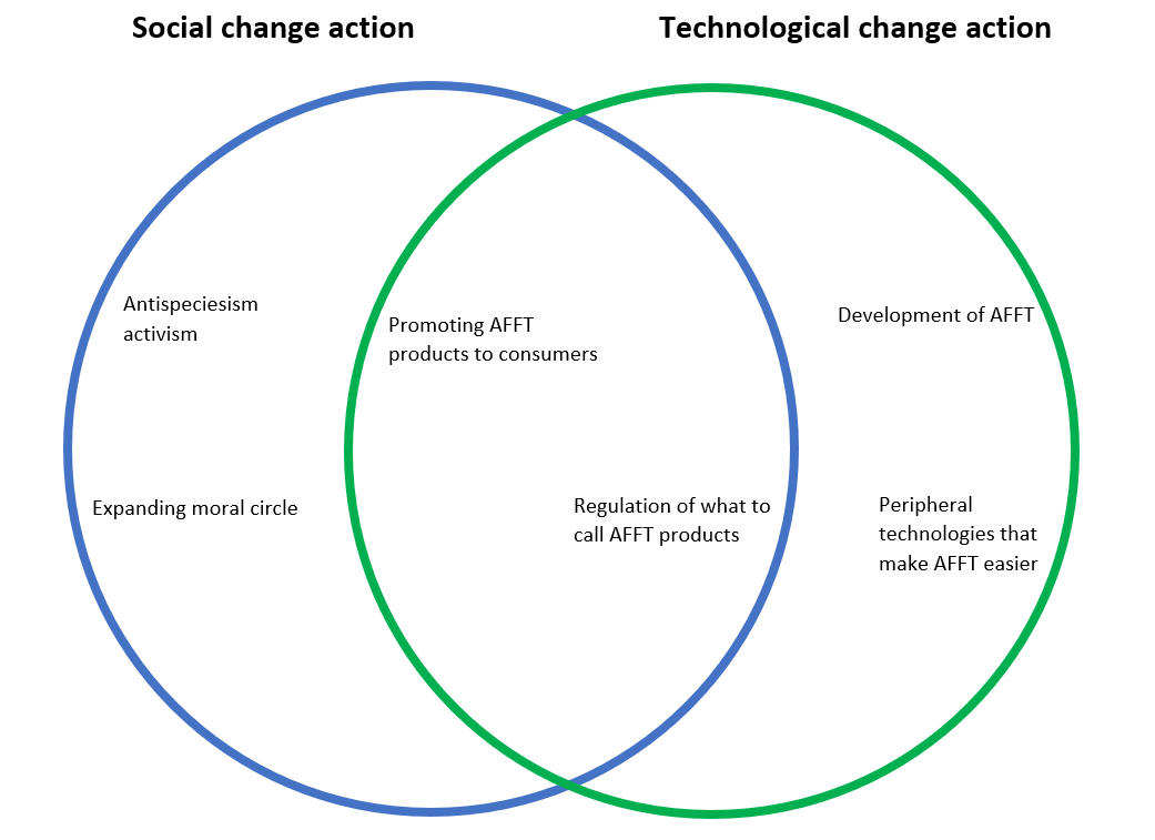 With these figures in mind, the end of animal farming could be driven primarily by social change, such as a rise in the moral consideration of animals, or by technological change, such as the introduction of realistic animal product alternatives that are cheaper and more environmentally friendly than animal products.[5][6] There are many ways in which social and technological change can, have, and will work together, but advocates inevitably face trade-offs between them in many marginal scenarios, such as deciding which organizations to fund or which jobs to take. There are many actions we can take that intuitively fit as both social and technological, and as with most dichotomies, it can be conceptualized as a multidimensional gradient, though a detailed embedding is beyond the scope of this post. Figure 1 shows some examples.