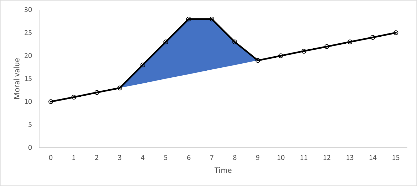 Figure 2: Position rubber banding. The blue zone shows the counterfactual difference caused by the moral progress that starts at time point 3 and reverts by time point 9.